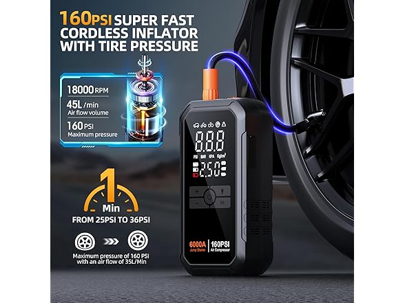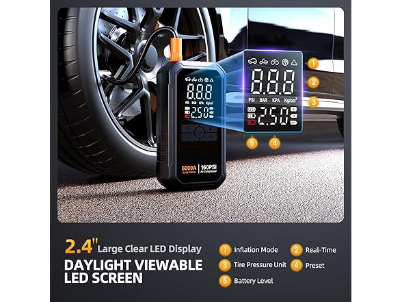 - 【5+4+4 SMART DIGITAL TIRE INFLATOR WITH LED SCREEN 】 Smart preset & auto shut-off without repeated adjustment and check. Long press the middle power button to turn on the device. With unique turbocharged 45L/Min (160 PSI) lasting 30 minutes. Not only that, the portable car jump starter quickly fills a tire to 25 PSI in just 2 minutes. 5 inflation modes (MAX 160PSI, with auto parameter memorization), 4 optional units, and 4 nozzles for wide applications (cars, motorcycles, bikes, balls, etc). Large comprehensive and sunlight-viewable screen reads real-time data and accuracy ±1 PSI. No guess and over-inflation