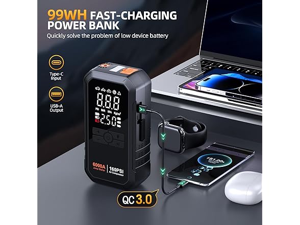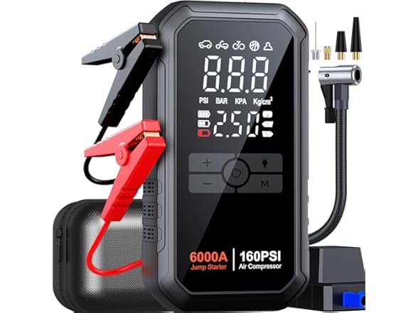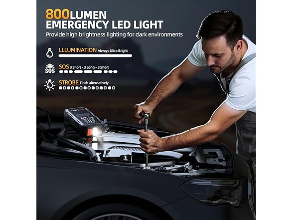 - 【10-IN-1 CAR BATTERY JUMP STARTER】The lithium battery jump starter is derived from the upgraded design of 2025. Say goodbye to the general car battery jump starter! H6 is more powerful. It's a car jumper starter portable, tire pump, pressure gauge, portable power bank, fast charging, and 4-mode lights (flashlight, strobe, warning, SOS). Portable, versatile, and must-have road trip kit for outdoors