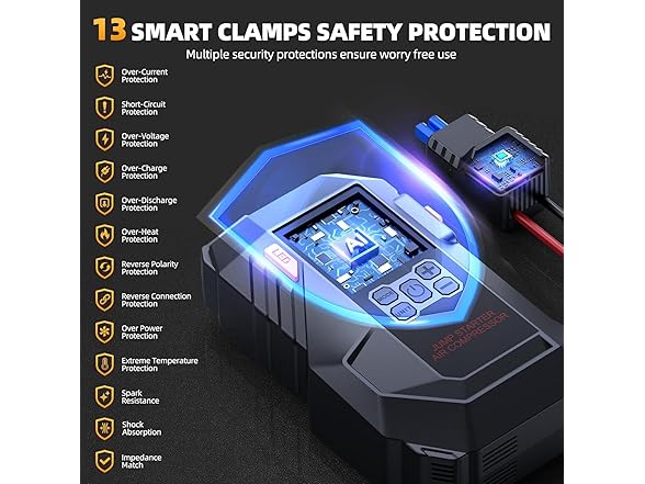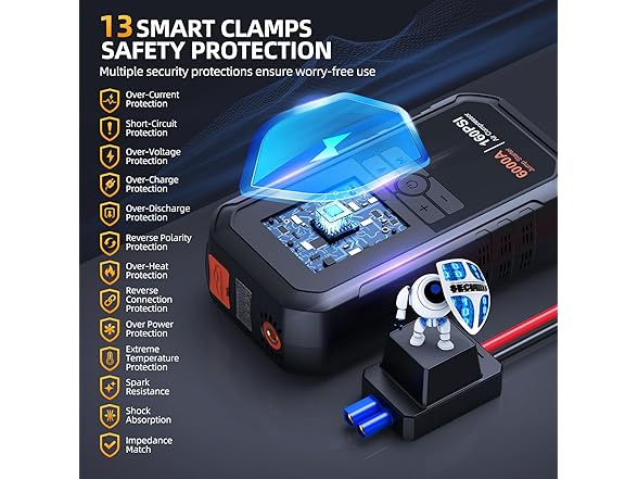 - 【MULTI-PROTECTION, SAFETY, AND SECURITY】H6 Jump Starter with extended heavy-duty jumper cables to reach varied battery terminals. The battery jump box automatically runs 13 PROTECTIONS to fully protect you and batteries from any improper operations. Extremely simple operation is good for all ages! The sturdy durable shell prevents the battery jumper pack from being damaged by rain, dust, and drops.jumper cables is auto-detect connection, and real-time visible alarms, the car battery charger jump starter portable is 100% safe, with no sparks