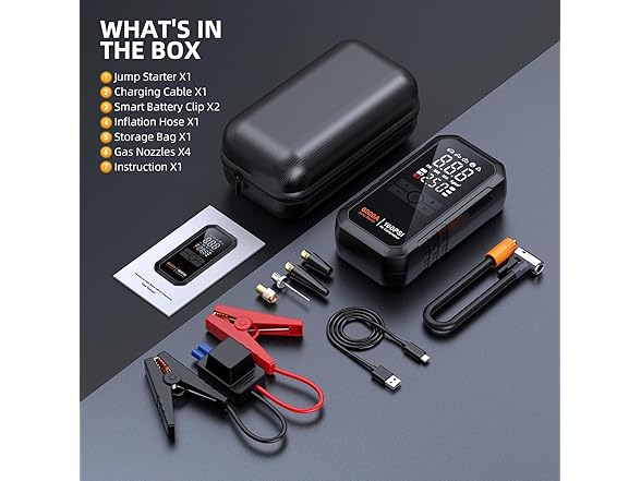 - 【WHAT YOU GET】1 X Heuuv Car Starter Jumper Power Bank X1, Practical Storage Bag X1, Smart Jump Cable X1, Safety Inflatable Line X1, Air nozzle X4, Type-C Charging Cable X1, User Manual X1 and 2-YEAR Warranty and lifetime tech support. If you have any after-sales questions about jump starters, please contact us