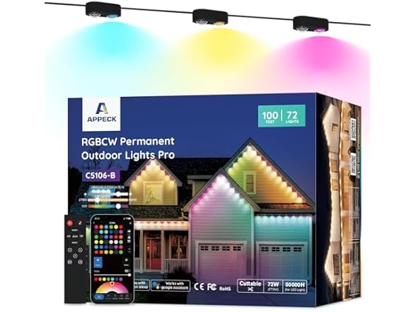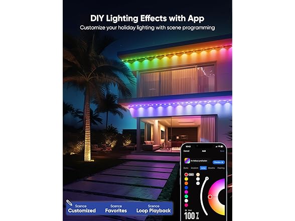- Customized Lighting with App: Each light can be individually controlled. 111 dynamic scenes can be edited by speed, color, etc. and saved to favorites for loop playback. In addition, the permanent christmas lights supports timer function and light string length setting