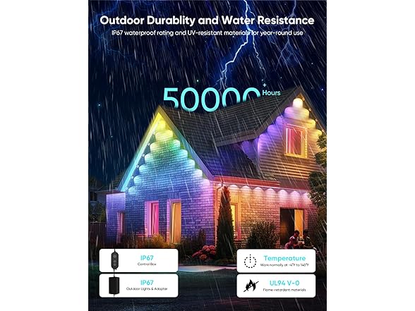 - Outdoor Durability: Thanks to UV-resistant materials, the permanent lights can withstand long time exposure without fading. The IP67 waterproof outdoor lights, IP65 waterproof of control box and adapter can withstand extreme weather. Operates well from -4°F to 140°F, up to 50,000 hours working life, suitable for year-round lighting
