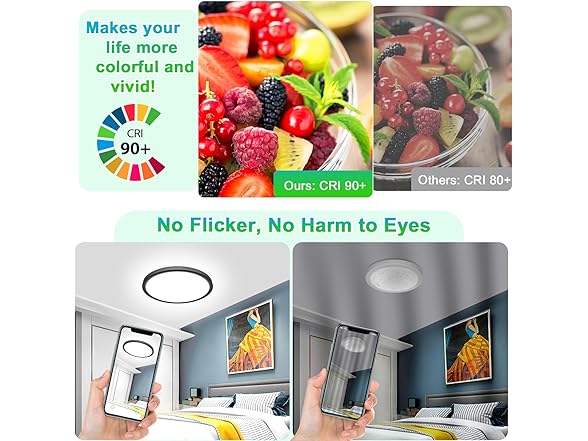 - 【Upgraded CRI 90+ for Vibrant, True-to-Life Colors】While most LED ceiling light fixture use 70-80+ CRI LED chips, our light features 90+ CRI LED chips, offering superior color accuracy. Unlike lower-quality options, it reduces eye strain, making it perfect for workspaces, vanity areas, and kitchens where precise color matters. Enjoy professional-grade, lifelike illumination.
