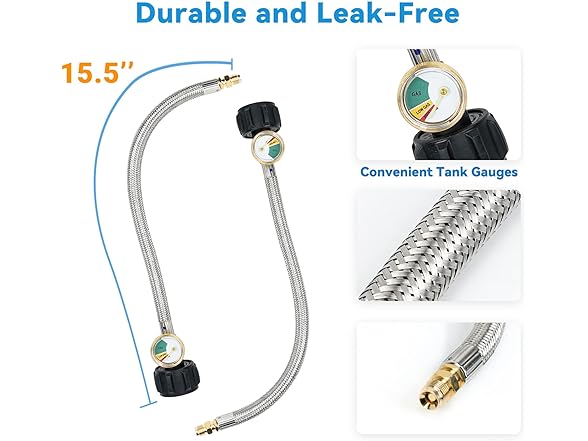 - Propane Tank Gauge Level Indicator - The rv propane connection hose set comes with two color coded dials, which helps you to monitor the fuel level at a glance without necessarily removing the tank.