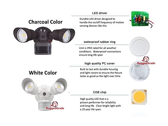 - HIGH TECH DESIGN –New LED modules Improve Efficiency and extend life. 50,000 Hour LED ensures a 20 plus year life and never having to change bulbs again. Premium grade components make this an industrial grade LED Flood light Color choices are White or Charcoal Black