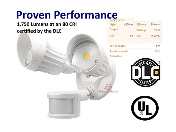 - BRIGHT LIGHT – Independently Rated by DLC. DLC Verified! The 20 watt is rated at 1750 Lumens. 1,750 Lumens to brightly light areas around your house. Motion sensor flood lights are ideal for visibility and security. 5000K light color ensures a bright clear light.