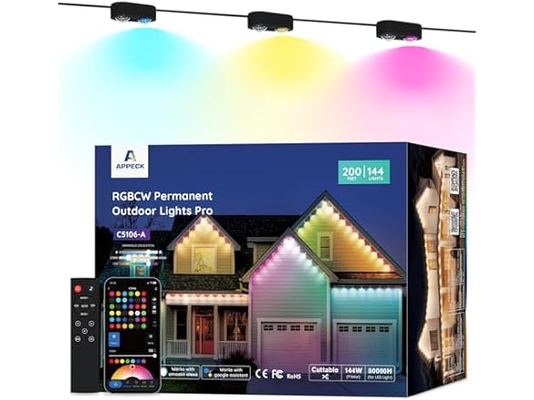 APPECK Permanent Outdoor Lights Pro 200ft, 144W RGBCW Eaves Lights with 144 LED Lights, 80lm, Cuttable, 111 Scene Modes, IP67 Waterproof Lighting for Christmas Decoration, Work with Alexa, Black