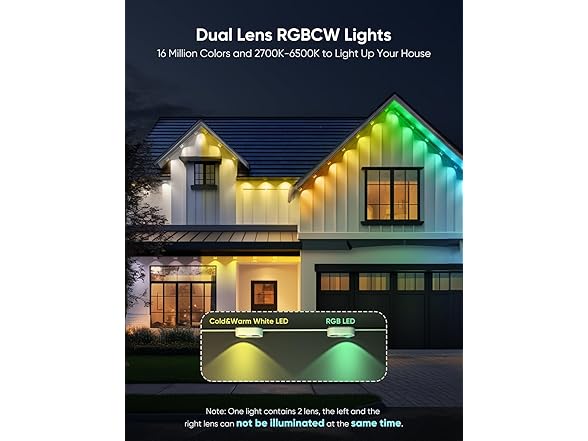 • Dual Lens Design: RGBCW LED lights design with unique dual head lens, the left permanent lights lens features RGB LEDs, and the right lens with warm and cool white LEDs to create vibrant lighting effects for holiday and daily lighting