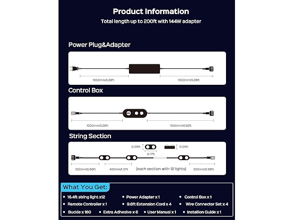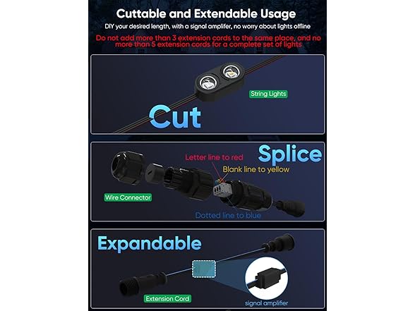 • Cuttable and Expandable: The led outdoor permanent lights can be cut and extended with wire connector set or extension cord. The extension cord with signal amplifier ensures that the whole set maintains a stable signal. Please note that a set of lights only can be connected up to 5 extension cords. If it is necessary to cut the light string, please refer to the installation guide for the correct installation method. Note that the total lights set is up to 200ft with 144W adapter