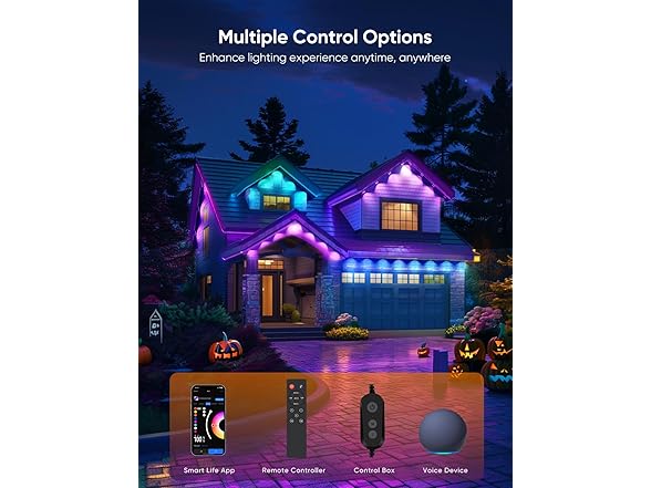 • Multiple Control Methods: The rainbow led permanent outdoor lights offer 4 different control methods: 1. App control(2.4G Wi-Fi only); 2. Alexa and Goggle Assistant voice control; 3. Remote control in weak WiFi signal; 4. Control box for on/off, reset and brightness adjustment. Each family member can choose a different control method. Note: the remote control does not include AAA batteries