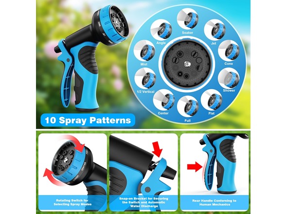 - 10 Spray Modes -- This spray nozzle features a non-slip, comfortable grip and a rotating bezel for switching between 10 different spray modes. It is easy to operate and won't strain your hand. With this flexible water hose, you can easily tackle a variety of watering and cleaning tasks, such as watering crops and flowers during different stages of growth, bathing pets, cleaning cars, floors, swimming pools, windows, and more. The 3/4-inch leak-proof connector is suitable for US garden faucets.