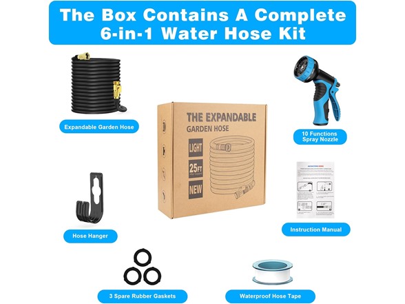 - Expandable Garden Hose 2.5 Times -- This flexible hose can expand to 25 feet within seconds after turning on the water pressure and quickly shrink back to a compact size for storage upon turning off the water pressure. Note: The garden hose has high elasticity, so please lay it flat on the ground and keep away from the hose nozzle when closing the water supply. When not in use, drain the water from the hose and store it in a cool, dry place.
