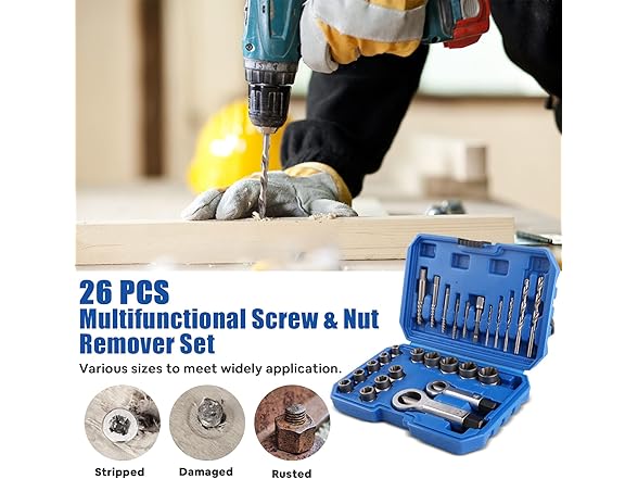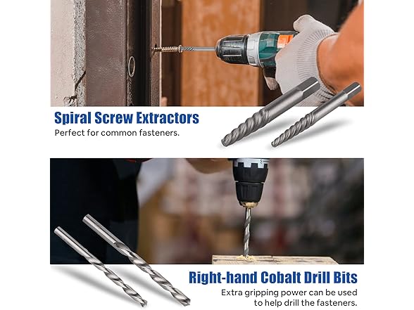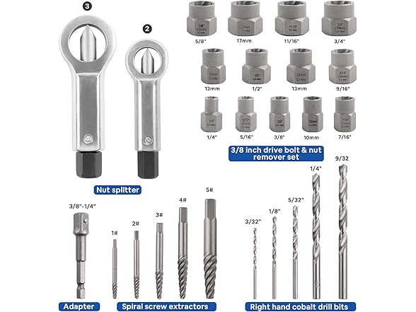 Wide Application: 5pcs spiral screw extractors, 5pcs right hand cobalt drill bits, 2pcs nut splitter, 13pcs 3/8 inch drive bolt and nut remover set, 1pcs 3/8"-1/4" adapter. Including various sizes of nut removal kits, was ideal for mechanics, steel workers & DIY use