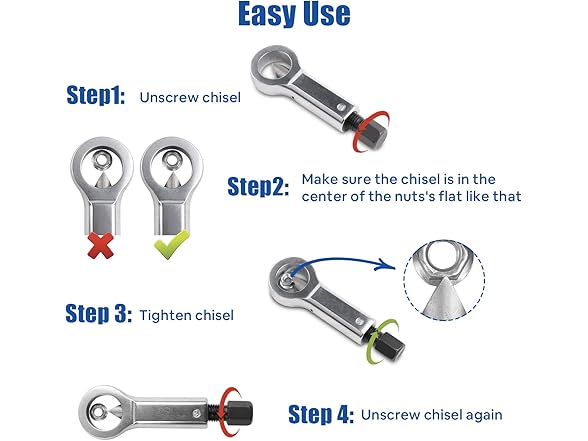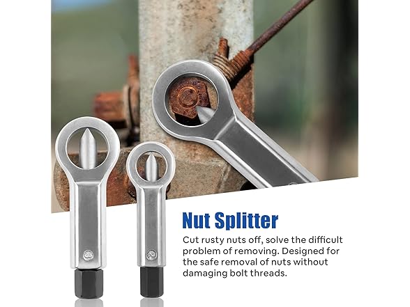 Premium Quality: This set is made of high carbon steel, sturdy and durable. Nut splitter is made of bearing steel, it is of high hardness and long durability. Suitable for splitting and removing rusty broken, damaged, corroded, stuck nuts. It's an essential tool in your daily life.