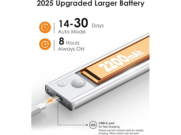 - ENHANCED BATTERY: The upgraded VerRon under cabinet light is equipped with a powerful 2200mAh (10 in.) or 3200mAh (14 in.) rechargeable battery, designed for long-lasting performance. With USB-C fast charging, a full charge takes just 3 hours. Enjoy worry-free, reliable lighting and say goodbye to frequent recharging and short battery life