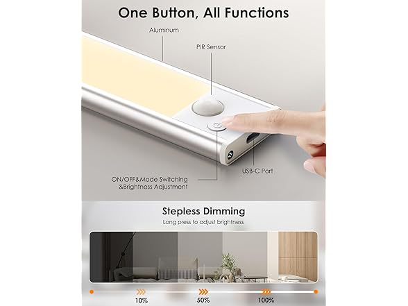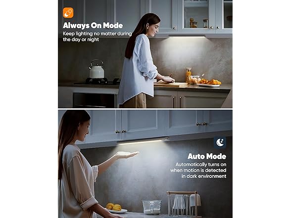 - TWO LIGHTING MODES: VerRon LED under-cabinet lighting offers two modes: Auto Mode and Always-On Mode. In Auto Mode, the advanced motion sensor detects movement and activates the light in dark environments, ideal for safe, hands-free illumination. Always-On Mode provides continuous light, perfect for cooking, reading, or other tasks