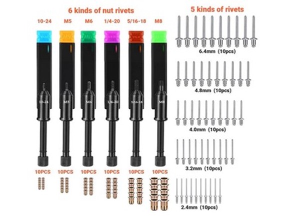 In the box: (1) Rivet tool with 6 interchangeable mandrels (M5, M6, M8, 10-24, 1/4-20, 5/16-18) and 60 rivet nuts, ensuring you have all the accessories you need for various riveting tasks.Sales Stats