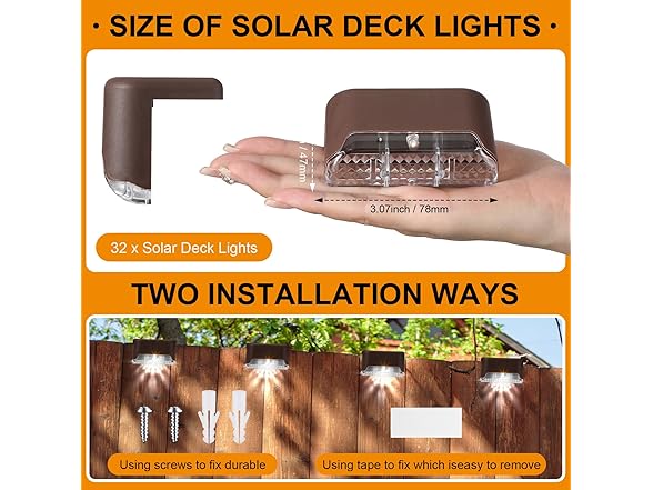 - Easy to Install: the solar outdoor deck lights are easy to install, no wires, simple and convenient to fix it in a proper position with screws or double sided adhesive tapes (the screws and double sided adhesive tapes are included); You can place it vertically or flat along any edge of stairs, decks, fences, steps