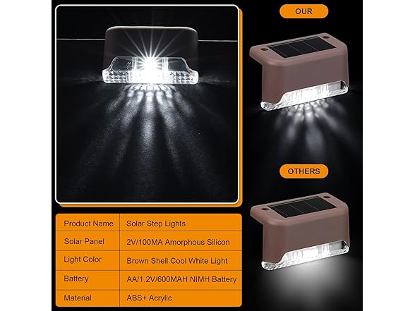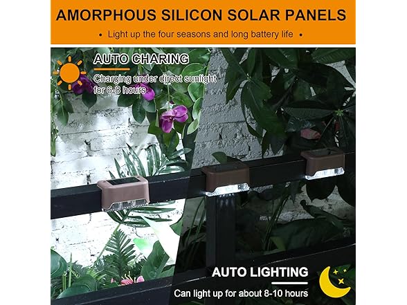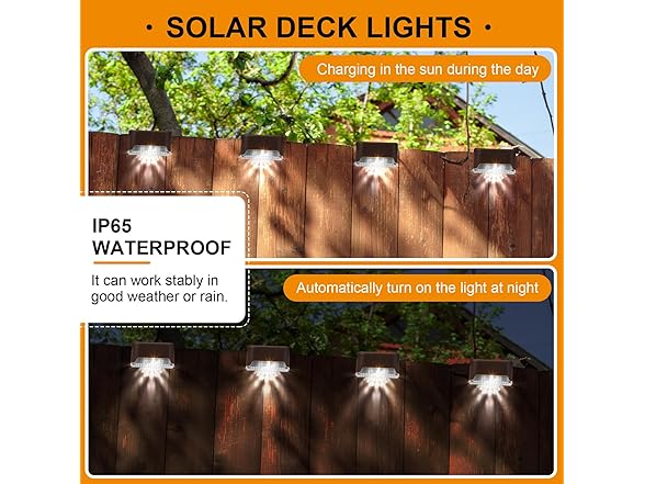 - Solar Power Supply: the solar deck lights are charged in the sun 6-8 hours during the day, supply power to LED lights at night up to 8-10 hours, intelligently identify the day or night, automatically light up at dusk and turn off at dawn