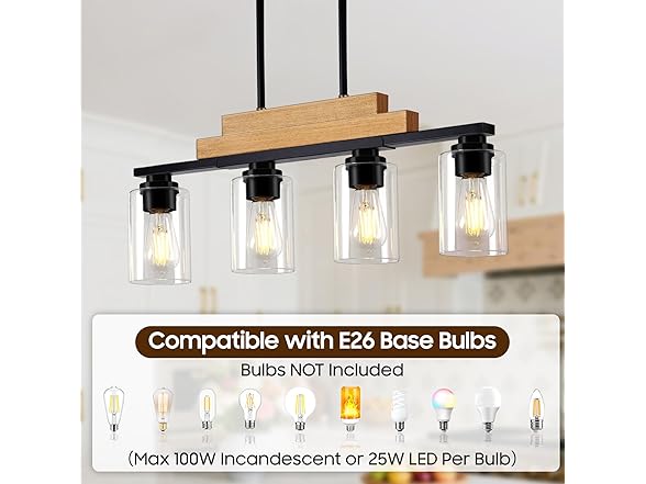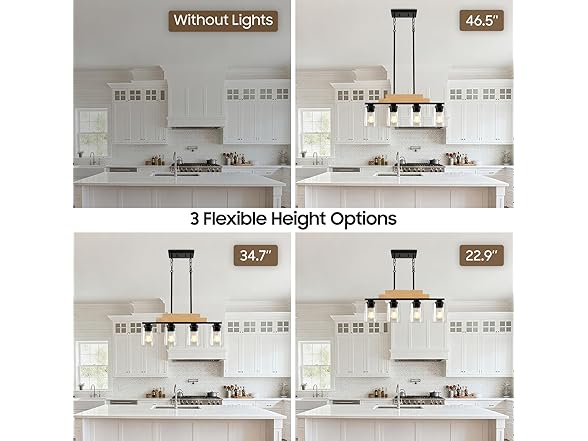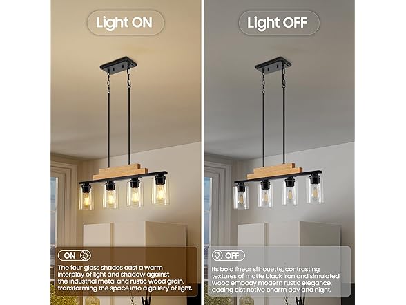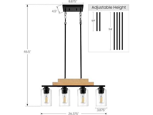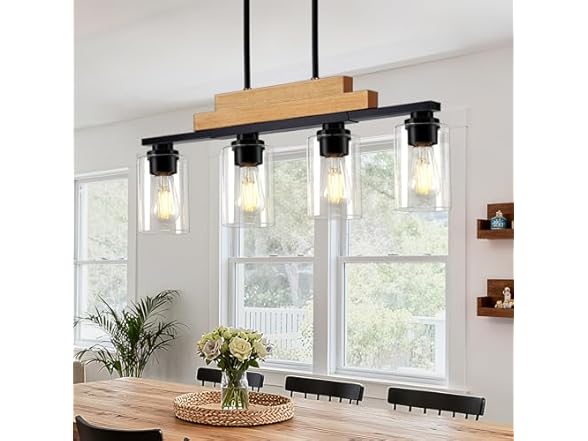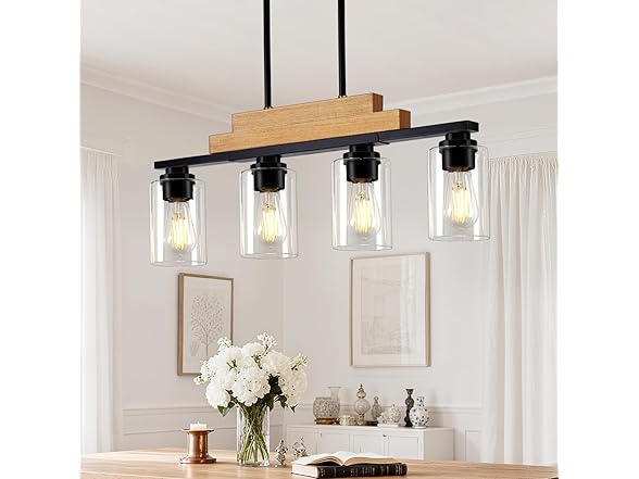 4-Light Linear Chandeliers for Dining Room Hanging, Farmhouse Dining Room Light Fixture Over Table, Black Pendant Kitchen Island Lighting, Wood Ceiling Light Fixture with Clear Glass Shade