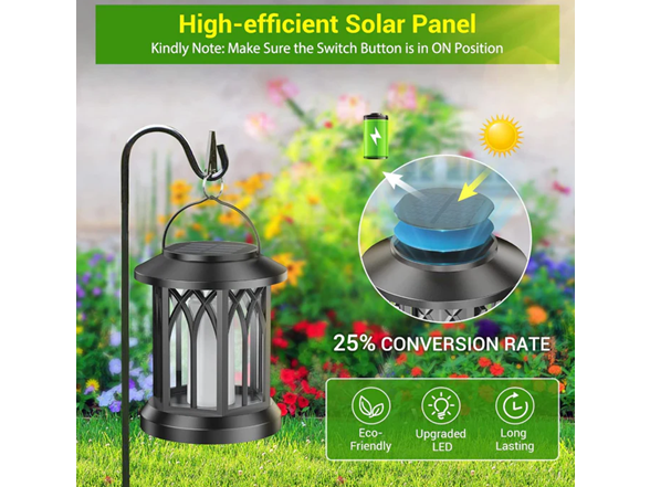 【Upgraded Solar Panel & Long Working Time】The solar panel of outdoor lanterns for patio waterproof is made of larger and more efficient monocrystalline silicon, the energy conversion rate is up to 25%, and the charging efficiency is higher than other outdoor solar lanterns . Solar outdoor lanterns equipped with 600mAh high-capacity battery, absorb and store more sunlight into electricity. Solar lanterns outdoor waterproof hanging could work up to 8-12 hours after being fully charged