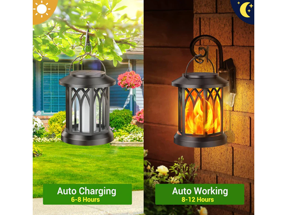 【Easy to Install & Auto ON/OFF】No other tools to install solar outdoor lights, simple tear-off film switch the button to ON at the back of solar candles outdoor waterproof, put flickering hanging solar lanterns directly under the sun for a charge. 100% solar powered, the solar garden lights will automatically turn on at dusk and off at dawn, save energy. The best lantern decorative to your patio, garden, walkway, yard