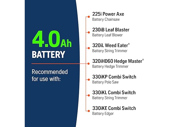 Keep your Husqvarna cordless tools powered with the Husqvarna B140 Battery. This integrated 40V battery is suitable for home use, offering high-capacity power for extended runtime. Specially designed for use with the complete Husqvarna MAX battery power tools, including chainsaws, this lithium ion battery offers excellent cooling and features an intuitive 3-LED charge indicator to easily read the battery life. This Husqvarna battery fits all Husqvarna MAX battery tools, which allows you to quickly switch the same battery between a trimmer, blower, chainsaw and hedge trimmer, so you can keep working until the job is done. The Husqvarna B140 Battery is designed for demanding, long-lasting use and provides 4Ah of power per fully charged battery. The 40 Volt lithium battery is equipped with an internal cooling system for fade-free power. The battery life is easy to read with the LED battery life indicator display. Husqvarna Li-ion batteries provide long-lasting power and top-class performance. Use this 40V lithium battery as an additional leaf blower battery, weed wacker battery, chainsaw battery and weed eater battery.