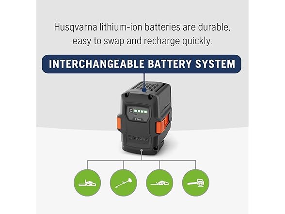 - INTERCHANGEABLE BATTERY SYSTEM: The 40 Volt lithium battery fits all Husqvarna battery tools, our lithium-ion batteries are durable, easy to swap and recharge quickly