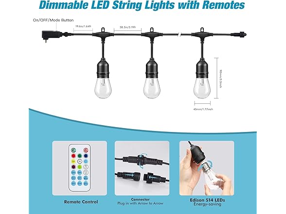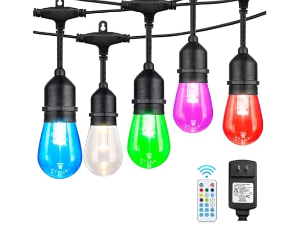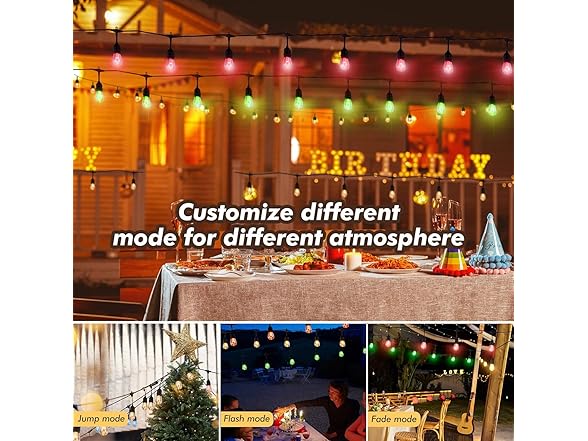 - String Lights for Outside with 6 Dynamic Effects:Besides the static mode, 1-pack RGB Outdoor string lights have 8 modes for your special occasion. Using the remote control, you can adjust the modes of strobe, fade, twinkle, breath, chaser, random, RGB flash, etc. to suit your different scenes. String lights uniquely support multiple colors at a time, turning the space into a colorful wonderland that will definitely surprise your guests and family with a fantastic lighting experience.