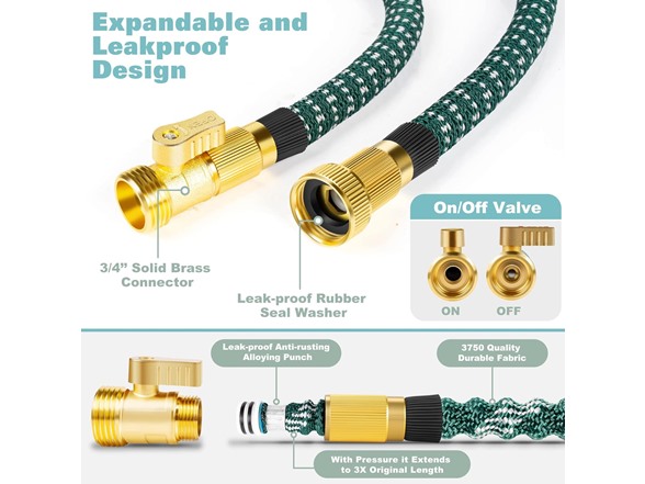 - Solid Brass Connectors - This expanding garden hose has superior quality solid brass connectors and shut-off valve. Rugged 3/4-inch Brass connector will not break, , leak or corrode. The newly designed 3-layer leak-proof connector and thickened rubber can effectively prevent ing and corrosion. The buckle stent is perfect for watering jobs, you don't have to hold the handle down anymore on the spray nozzle.