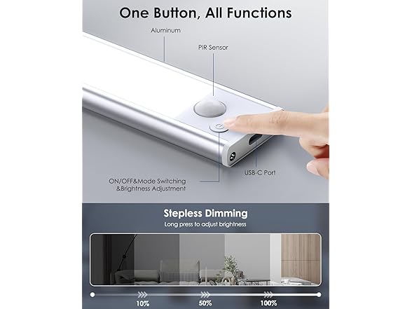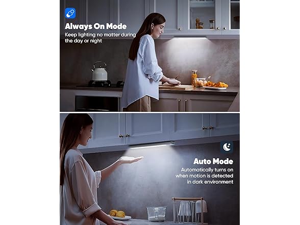 - TWO LIGHTING MODES: VerRon LED under-cabinet lighting offers two modes: Auto Mode and Always-On Mode. In Auto Mode, the advanced motion sensor detects movement and activates the light in dark environments, ideal for safe, hands-free illumination. Always-On Mode provides continuous light, perfect for cooking, reading, or other tasks