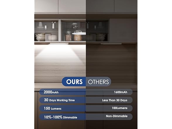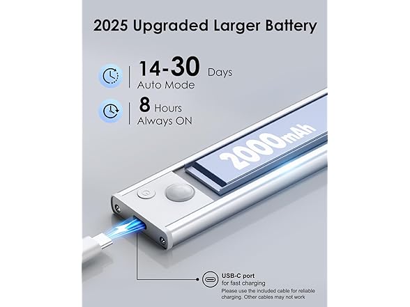 - ENHANCED BATTERY: The upgraded VerRon under cabinet light is equipped with a powerful 2000mAh (8 inch), 2200mAh (10 inch), or 2500mAh (12 inch) rechargeable battery, designed for long-lasting performance. With USB-C fast charging, a full charge takes just 3 hours. Enjoy worry-free, reliable lighting and say goodbye to frequent recharging and short battery life