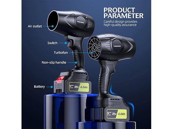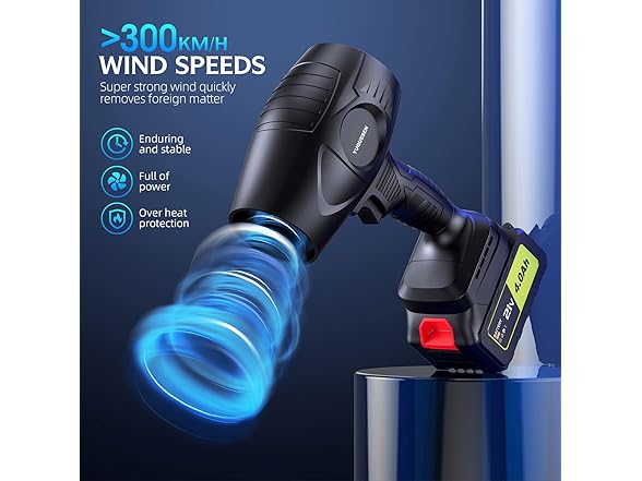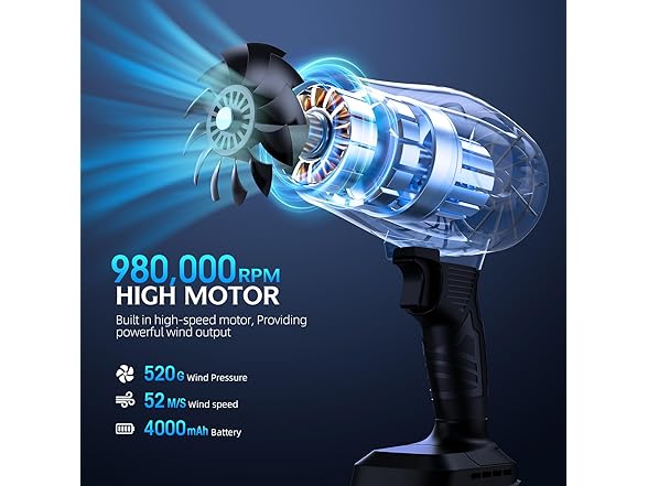 - YUQUESEN leaf blower is designed with a high-speed turbine motor with a rotational speed of up to 980,000 RPM. cordless Leaf blower generating a high-speed airflow of more than 50 M/S. The electric leaf blower power is long-lasting and stable, so it will not overheat even when working at full load for a long time. Cordless blower say goodbye to the trouble of bending down to rake fallen leaves and back pain.