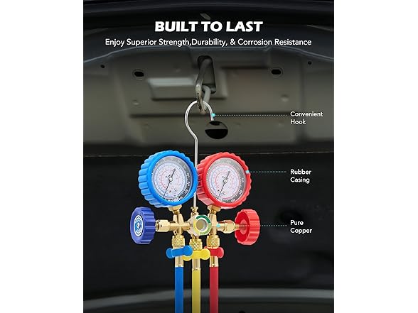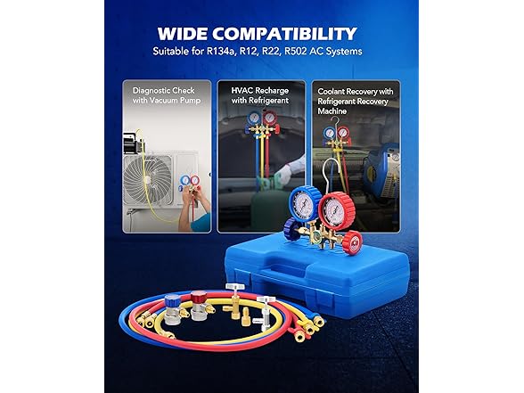 - WIDE APPLICATION: This car AC gauge set works with R134a, R12, R22, and R502 refrigerants; ideal for both DIY and professional HVAC maintenance, it allows you to measure your system's pressure, evacuate and refill coolant, and more