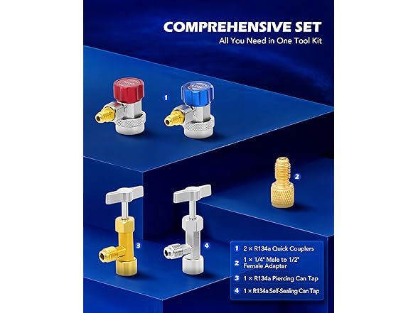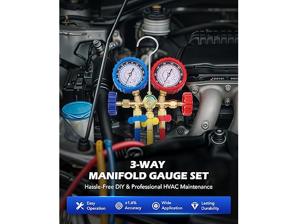 - COMPLETE GAUGE SET: This professional automotive AC tool kit includes a 3-way gauge, 3 color-coded hoses, 2 adjustable 1/4'' quick couplers, a 1/4'' to 1/2'' Acme adapter, and both self-sealing and puncture-style can taps