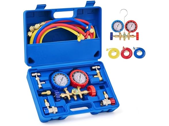 This professional automotive AC tool kit includes a 3-way gauge, 3 color-coded hoses, and helpful accessories for hassle-free setup and easy operation whether at home or in your shop. Our reinforced gauges combine the best features of dry and liquid-filled core gauges to offer durable cold and shock-resistant service. Their featured calibration screws and moisture indicator provide accurate readings and quick monitoring of your coolant’s condition. The 3 provided hoses are color coded to easy use. Each 5 foot hose has a reinforced 4-layer design and is capable of handling usual pressures up to 600 psi (burst pressure: 3000 psi). This car AC gauge set works with R134a, R12, R22, and R502 coolants. Built-in barriers ensure the purity of your refrigerant by condensation and other moisture as you work. With 2 adjustable couplers, and both puncture-style and self-sealing can taps, you can recharge your system without worry. This automotive AC gauge set is made from premium brass and aluminum for long lasting strength and corrosion resistance. A heavy-duty blow-molded carrying case comes included for easy storage and transport between jobs.