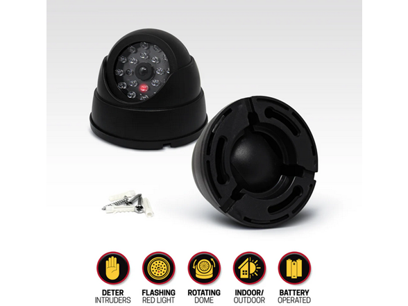 Enhance your home or business security with this realistic Set of 2 Decoy Security Cameras. Designed to mimic the look of real surveillance cameras, each unit features a flashing red LED light to simulate active monitoring, deterring potential intruders or vandals.
