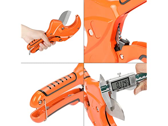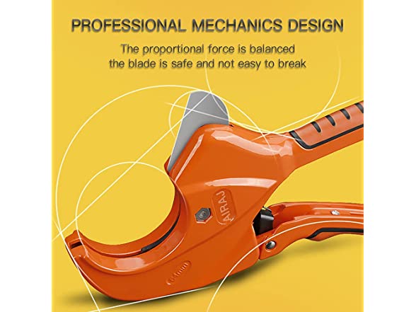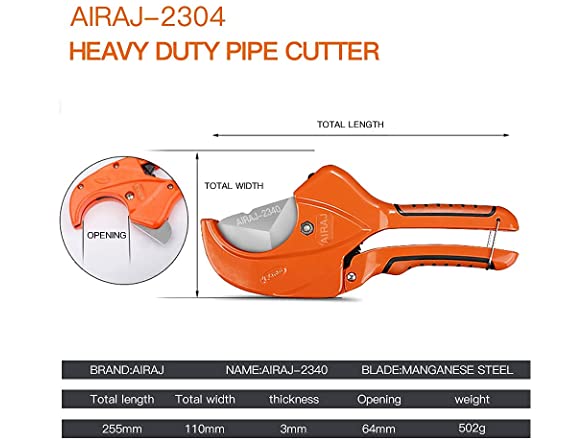 Size:64MMPRODUCT NAME: AIRAJ pvc cutterMATERIAL: Al handles,steel bladePACKAGE INCLUDE: pipe cutter(64mm) 1COLOR: orangeWhy do you need our Pipe Cutters?1.Unique triangle sharp bladeThe cutting machine is equipped with a sharp blade that ensures easy and fast direct and precise cutting, making your work more relax2.Ergonomic design:Powerful ratchet drive technology allows you to cut with one hand.The rubber handles fits perfectly into your hand, providing comfortable balance and control, helping to reduce fatigue in one-handed operation and making it easier to operate.3.Widely use:With incredible versatility, they design for pipe applications.Commonly used for cutting most plastics (PVC, CPVC, PP, PEX, PE, rubber hoses) and multi-layer pipes, used in a variety of applications to complete the project you need.4.Safety:There is a stainless steel safety buckle at the bottom of the pipe cutting machine, which is firm and thick. When you are finished using it, you can buckle the safety buckle to avoid the danger of children touching.WARM TIPS1.Do not use to cut metallic pipes or cable wire, which will damage your blade.2.When using this Product in Winter it is Advisable to Put the Pipe in Lukewarm Water to Heat,this will Avoid Burst Pipes due to Cold Making Pipes Fragile for Cutting.3.After use We Recommend Rustproof Oil is Applied to the blade.4. In order to cut the ideal slit, please keep the slit at least 1.5 inches away from the nozzle.