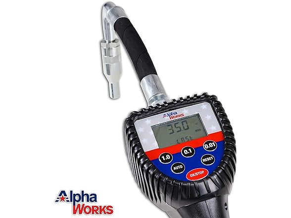 - GEARHEAD SPECS - This AlphaWorks Preset Digital Control Valve has a Max Flow rate of 10GPM / 35LPM, at a precision of ±0.5%, handling Viscosity of 8-5000mPas, w/ a Max Pressure Range of 7Mpa 0.5-50BAR / 7-1000PSI. An Inlet Connection of 1/2" NPT Female connecting to industry standard oil hose reels & battery powered w/ 1x Alkaline Cell 9v Battery, all together weighting 3.3 lbs, including the Digital Preset LCD Meter & Flexible Spout.