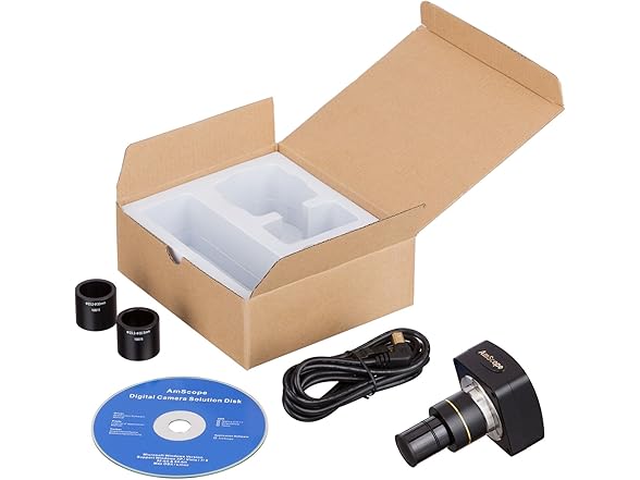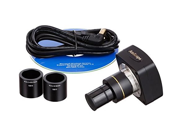 This 10MP microscope digital camera, with its unique stand alone design, comes with a reduction lens, a USB cable and two adapters. The digital camera captures still microscopy images, streams live videos on your computers, and is compatible with Windows XP/Vista/7/8/10, Mac OSX, and Linux. The user-friendly software for Windows offers advanced features including Stitching, EDF (Extended Depth of Focus), video recording, and measurement functions. Live video and still image capture can be set in different resolutions simultaneously. The 0.5X reduction lens gives larger field of view. You can edit and process images in a manner similar to PhotoShop. The stand alone software included allows you to make notes, shapes, watermarks, and precise measurements with ease. You can analyze, present, and share images of samples and specimen by simply plugging one end into your computer's USB 2.0 port, and the other on your microscope's eye-tube or trinocular port. Featuring built-in C-mount compatibility and 23mm reduction lens adapter, our camera can be attached to any instrument with a C-mount or a 23mm, a 30mm and a 30.5mm photo port. The camera is equipped with CMOS color sensor, and comes with a high-speed USB 2.0 cord, four mounting sizes (23mm, 30mm, 30.5mm, and C-mount), and instructions. We are based in the USA and all our cameras come with a life-time of software upgrades. It arrives brand new in a factory sealed box.