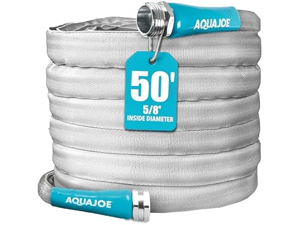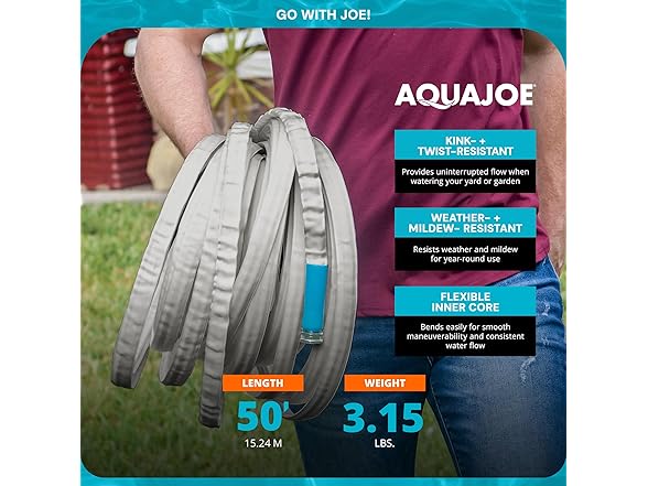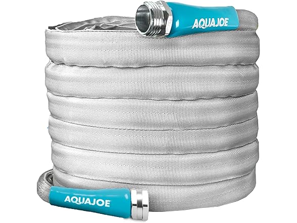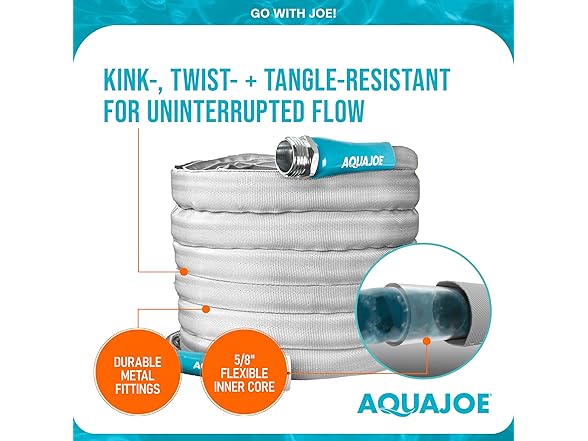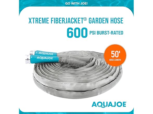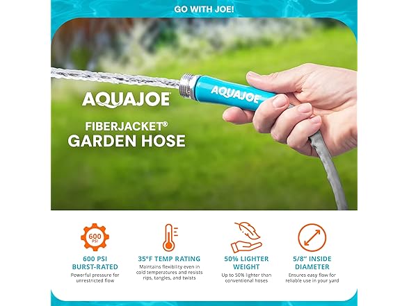 Say goodbye to tangled and heavy hoses with the Aqua Joe XTREME FIBERJACKET Flexible, Kink-Resistant Garden Hose. Engineered for high performance and durability, this hose features a 5/8-inch diameter with a rugged, marine-grade FIBERJACKET exterior surrounding a flexible 5/8-inch inner core. Burst-rated up to 600 PSI, it delivers superior strength while remaining ultra-lightweight and easy to handle. The kink-, twist-, and tangle-resistant design ensures a continuous, steady water flow, and the compact construction makes it simple to coil and store. Available in multiple lengths, it’s the ideal solution for everything from garden and lawn care to cleaning patios, garages, or boat docks. Designed for comfort and reliability, this hose includes sturdy, flexible grip handles and heavy-duty metal fittings for a secure, leak-resistant connection. Built to withstand cold temperatures down to 35°F, it resists grime buildup and stays flexible season after season. The tough, rip- and abrasion-resistant jacket is gentle on painted and delicate surfaces, so you can move it freely without worry. Keep your lawn and garden lush with Aqua Joe! Our robust collection of hoses, nozzles, and sprinklers is built for every type of property and is designed to help you maintain a beautiful outdoor space, year after year. Aqua Joe is part of the Joe family of brands—dedicated to designing, manufacturing, and marketing innovative, high-quality tools for the home, yard, garden, and garage. With a people-first mindset and purpose-driven solutions, we provide the right tool for every job—making it easy to Go With Joe and get it done right.