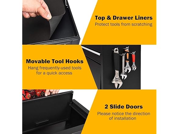 Spacious Storage Space for Versatile Use: Our toolbox has 6 drawers, a large bottom cabinet and a top box drawer, which allows you to organize and store all kinds of tools. Additionally, the side hooks in the lower box offers extra space for wrenches, measurements and other items.