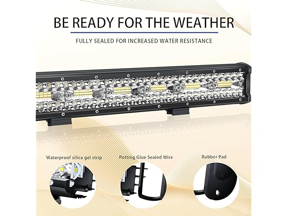 - The LED light bar is protected from water with a waterproof soft strip, silicone seal, and waterproof rubber pad, ensuring it can withstand harsh weather conditions like rain, snow, and storms. It's perfect for a variety of exterior applications.