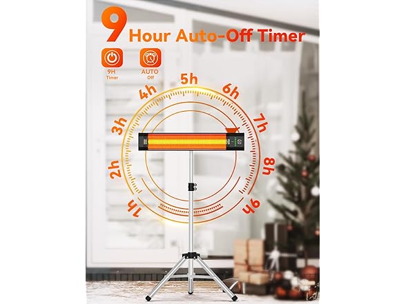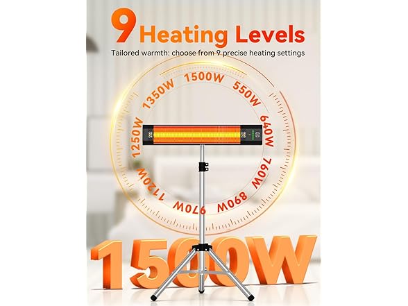- 【9 Adjustable Heat Settings 】This infrared heater with 9 heating levels, the LOW setting (900W) conserves energy for gentle warming, while the High setting(1500W) delivers robust heat, you can finely adjust the temperature according to personal preferences or environmental changes to ensure optimal comfort. From a gentle warmth to a more intense heat, this patio heaters allows you to find the perfect setting for any situation, making it ideal for all seasons and varying room sizes.
