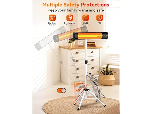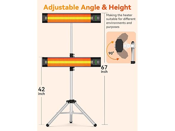 - 【Adjustable Height and Angle for Customized Comfort】Our outdoor heater is designed with adjustable height settings ranging from 42 inches to 67 inches, allowing it to adapt seamlessly to various room configurations and individual preferences. Furthermore, the garage heater features a 90-degree tilt function, enabling you to direct the heat precisely where it is needed most, and the flexible design of this portable heater outdoor ensures optimal comfort and convenience.