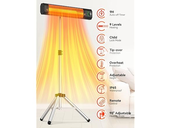 Experience the ultimate in heating technology with our heater, featuring Advanced Carbon Infrared Technology for instant warmth that directly targets the body, reducing energy loss and ensuring eco-friendly, energy-efficient performance. The space heater's Adjustable Height and Angle allow you to customize the warmth to your needs, while the 170° Wide Oscillation ensures even heat distribution across up to 300 square feet. With a Weather-Resistant Design boasting an IP65 Rating, our BALKO garage heaters for indoor use is perfect for outdoor use, making it ideal for patios and porches as well as indoor spaces like bedrooms, living rooms, and garages. The 9 Adjustable Heat Settings and 9-Hour Timer offer precise control, and Convenient Control with Panel and Remote means easy adjustments from anywhere in the room. Enhanced safety features include a Children Safety Lock, Tip-Over Protection, and Overheat Shut-off, ensuring peace of mind in any setting. Package including outdoor patio heater, remote controller, tripod.