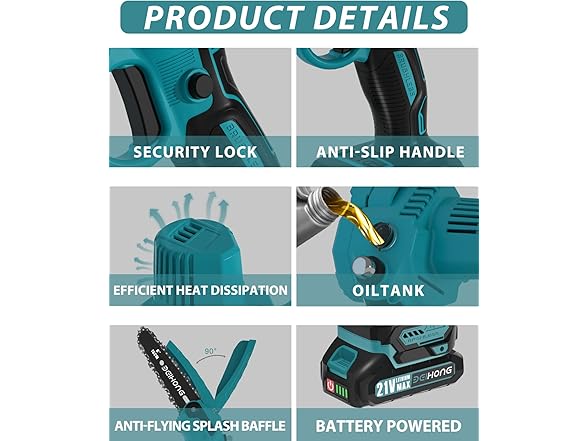 - ✔ Safe And Reliable - 4 security measures to ensure that the mini chainsaw has reliable safety: ①Switch lock to prevent accidental activation to protect your family.②Baffles prevent debris splash.③Comes with goggles to protect the glasses from wood chips ④rubberized handle makes you more comfortable to hold and easier to control. Certified by CE/FCC/ETL, you could be assured of its safety and reliability.