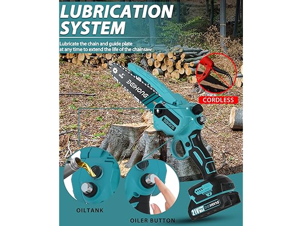 - ✔ Upgrade Lubrication System - The mini chain saw is equipped with an upgraded chain lubrication system. for various quality chain lubricants.You can freely lubricate the chain at any time by just pour the lubricant into the oil tank; Less wear, longer chain and chainsaw life, and smooth cuts!!