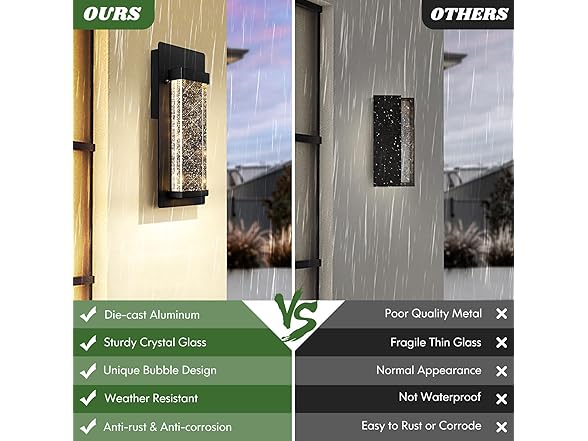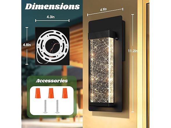 - Easy Installation: Our outdoor crystal wall lights arrive pre-assembled, requiring only the final installation onto your wall. All necessary mounting hardware and comprehensive instructions are provided. Should you encounter any issues, please don't hesitate to reach out to us through Amazon for assistance
