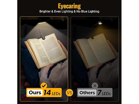 - Horizontal Head for Wide Illumination: This book light has a horizontal head that spreads light evenly across pages, making it ideal as book lights for reading at night or a book light for reading in bed. The 14 LEDs and ABS material lampshade create steady light, so this book reading light is bright enough to read clearly yet soft to protect your eyes. It works well as reading lights for quiet nights without disturbing others